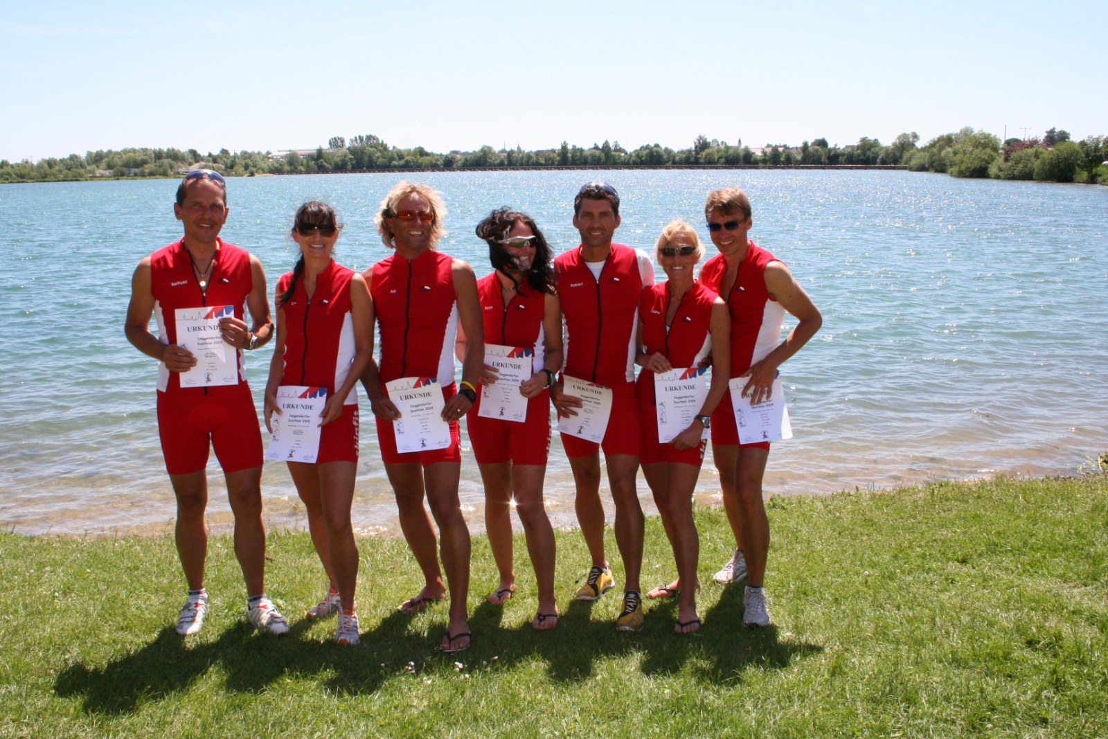Schon wieder die ROTEN – mussten wir uns anhören, nachdem alle 7 aktiven RCI’ler beim diesjährigen Deggendorfer Duathlon (5-19-5) angetreten u. alle einen Trepperlplatz erreicht haben. Es war nicht nur der Tag der Premiere unserer frisch bedruckten, roten Skinfit Wettkampfoutfits, sondern auch f. die meisten der erste Duathlon. Und wer nicht schon mal einen gemacht hat, der weiß gar nicht, wie anstrengend 5km laufen, 19km radfahren und nochmal 5km laufen sein können. Unser Schneggal Sabine konnte neben ihrem W40 Altersklassensieg auch noch den Gesamtsieg bei den Frauen verbuchen. Tanja ebenfalls Platz 1 bei den W30 und den 3. Platz bei den Gesamtfrauen. Bei den Männern belegte unser roter Maikäfer, ehemals der grüne Frosch, Adi ebenfalls den 1. Platz seiner AK M35. Wie bei allen Wettkämpfen dabei, unser Toni mit Platz 5 seiner AK. Unsere schicke Mixed Staffel Robert (Lauf), Berthold (Radfahren) u. Evi (Lauf) eroberten den 3. Stockerlplatz. Alles in allem konnten wir 4 Sixpacks Bier mit nach Hause nehmen, welches wir bei Gelegenheit feiern werden. Großer Dank auch wieder unseren RCI Unterstützern Eva, Sepp, Franz & Bernd welche keine Mühen scheuten an diesem tollen Sonnentag nach Deggendorf zu kommen nur um uns zu unterstützen!